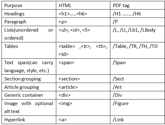 - Semantic structure. Correct use of HTML or PDF tags that describe the meaning and role of each element.