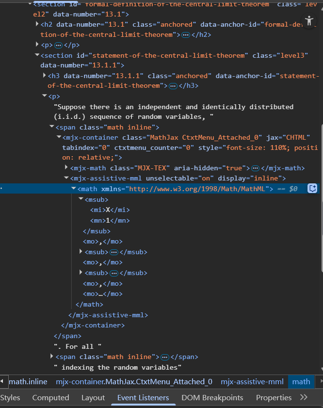 <math>elements,role= "math", oraria-label="..."attributes. These are signs that MathJax has rendered the math in an accessible way. You can switch to Accessibility tree with semantic structure to inspect for accessibility.
